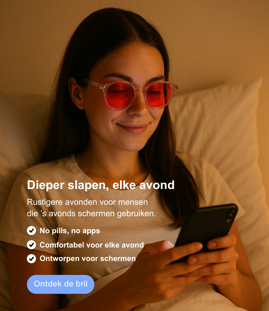 Een kleine verandering met groot effect. Draag de bril in de uren vóór bedtijd en help je lichaam vanzelf tot rust te komen — no pills, no apps.